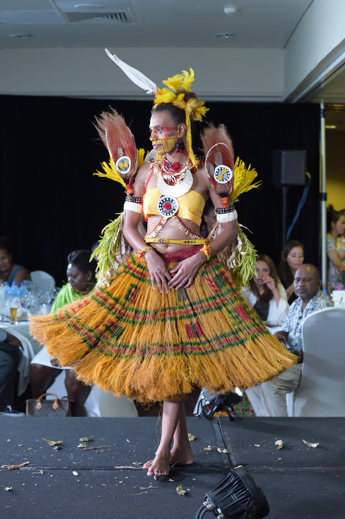 How does this happen? Each contestant wears (traditional and day wear) that is original and handmade. The dress could be made using tapa cloth or hand knitted string made fibre (hilum) from natural fibre, shells, bark etc. The headdress and body adornment would come from the province of their heritage and most likely made by family members. Each contestants have to perform a traditional dance from her own heritage. Bear in mind PNG has over 330 languages and 22 provinces with many tribal groups.