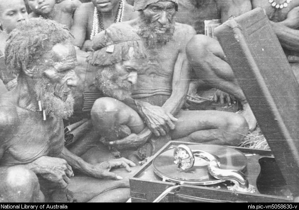 Leahy, Michael J., 1901-1979. Papuans looking at first gramaphone, Mount Hagen, Papua New Guinea, 1933 PPIc: National Library of Australia.