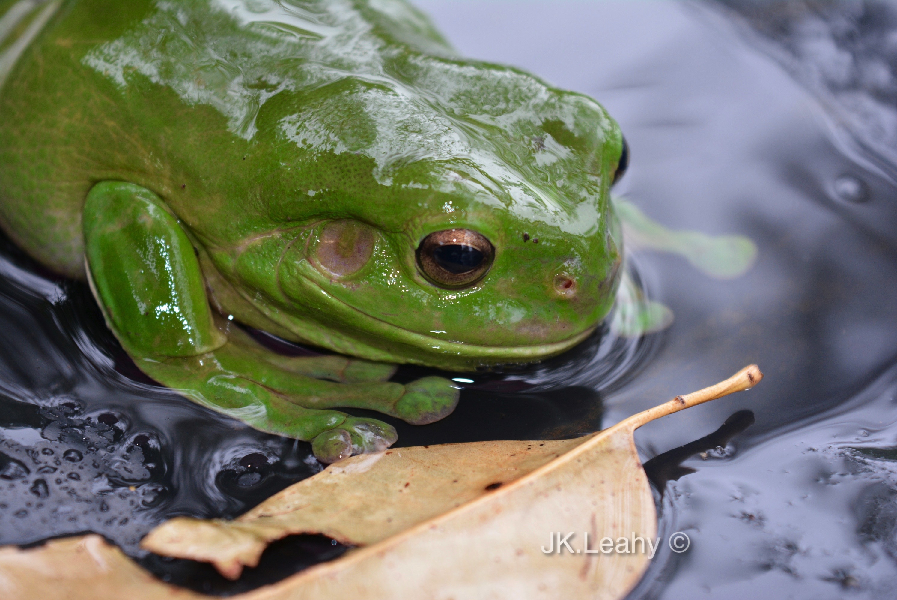 This frog, the Litoria caerulea or the Green Tree Frog lives in Queensland. It is also found in northern and eastern Australia. It is generally a large frog, and grows to 110mm. The frog is green to light brown or even blue, short snout and rounded face. It has a smooth, thick skin on head and shoulders. Some have white spots or irregular stripe from mouth to forearm. Its abdomen is white and the back of its thighs is sometimes maroon or yellow. More information can be found on Save Our Waterways.