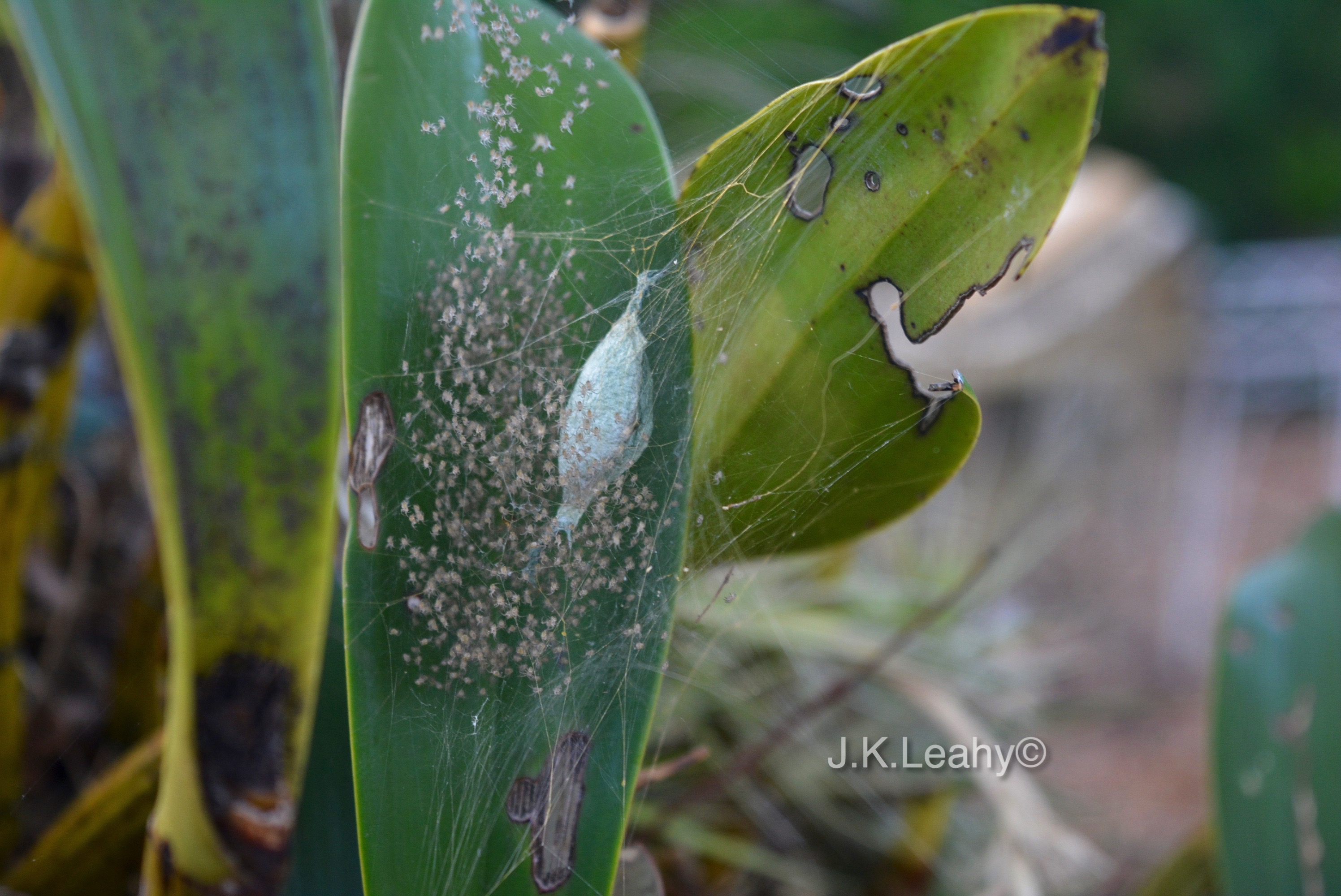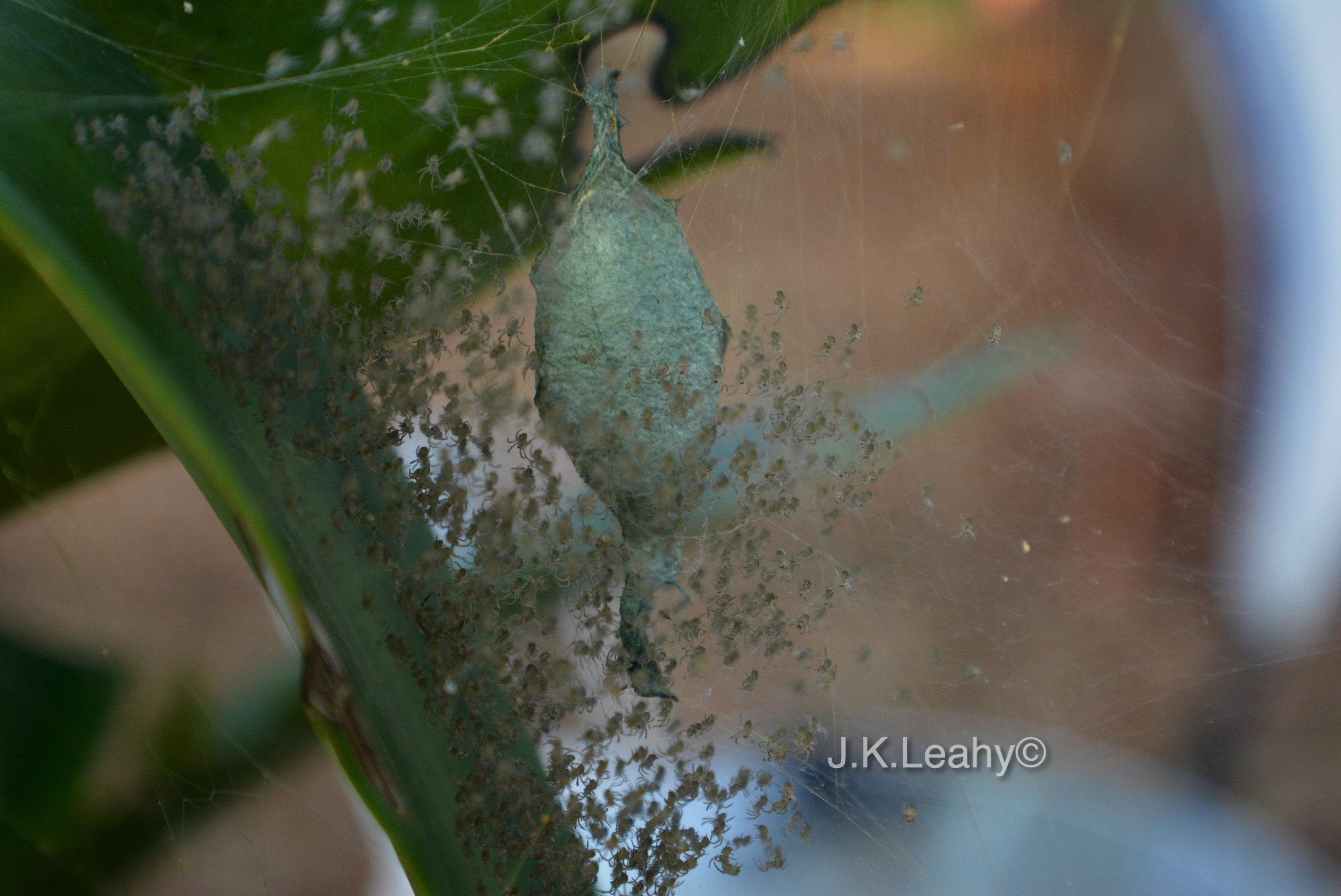 I shot this spider and the green bullet looking pouch (pictured below) with babies, over two days before they disappeared from my garden. That was a few days ago. It was a burst of life with small moving creatures on the dull sturdy orchid plant – a typical Queensland nature. The black ant should give you an idea of how tiny these babies were.