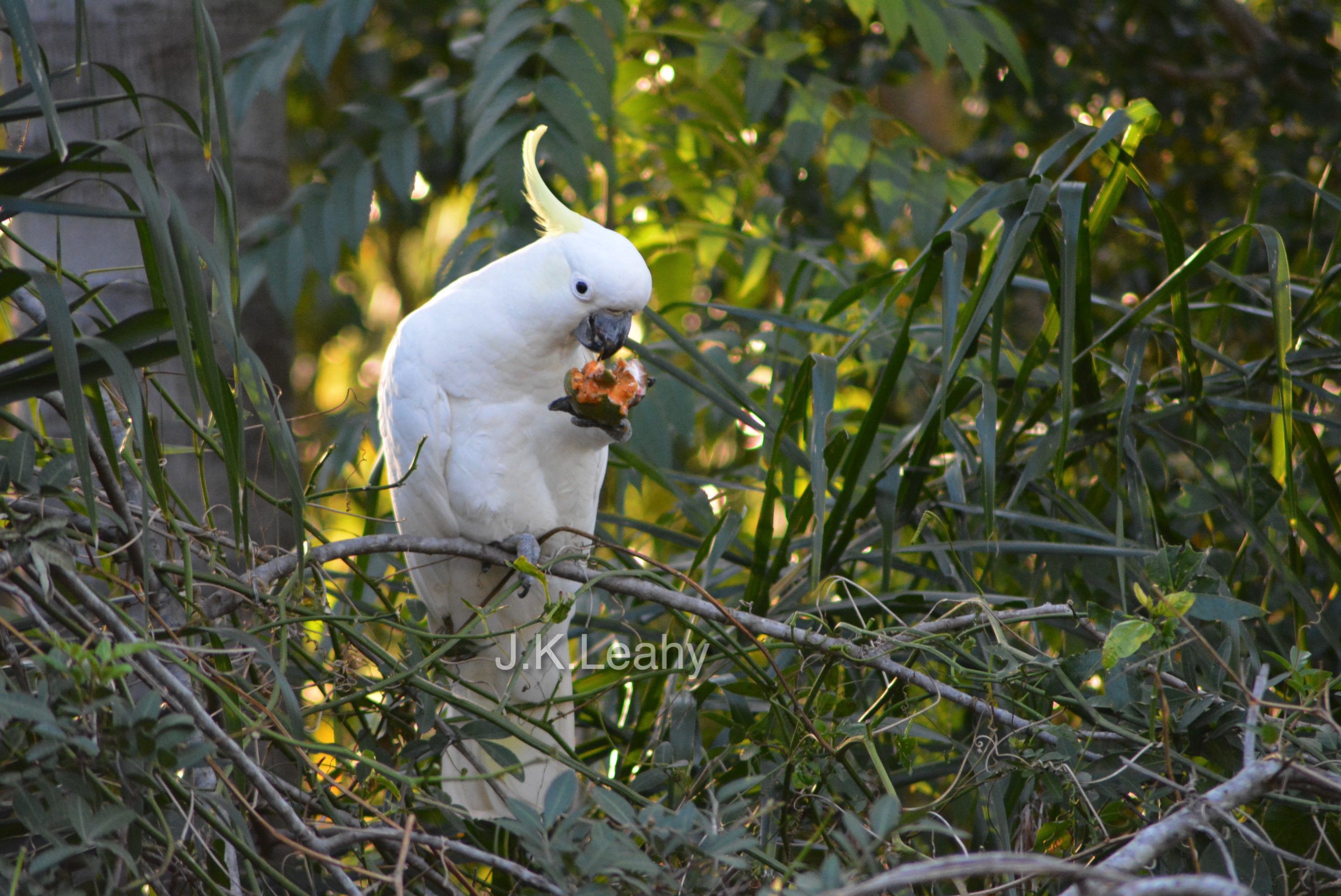 J.K.Leahy PIc. Sulphur-crested cockatoo eating a passion fruit. Is that a look of remorse at being caught red-handed or a look of defiance?