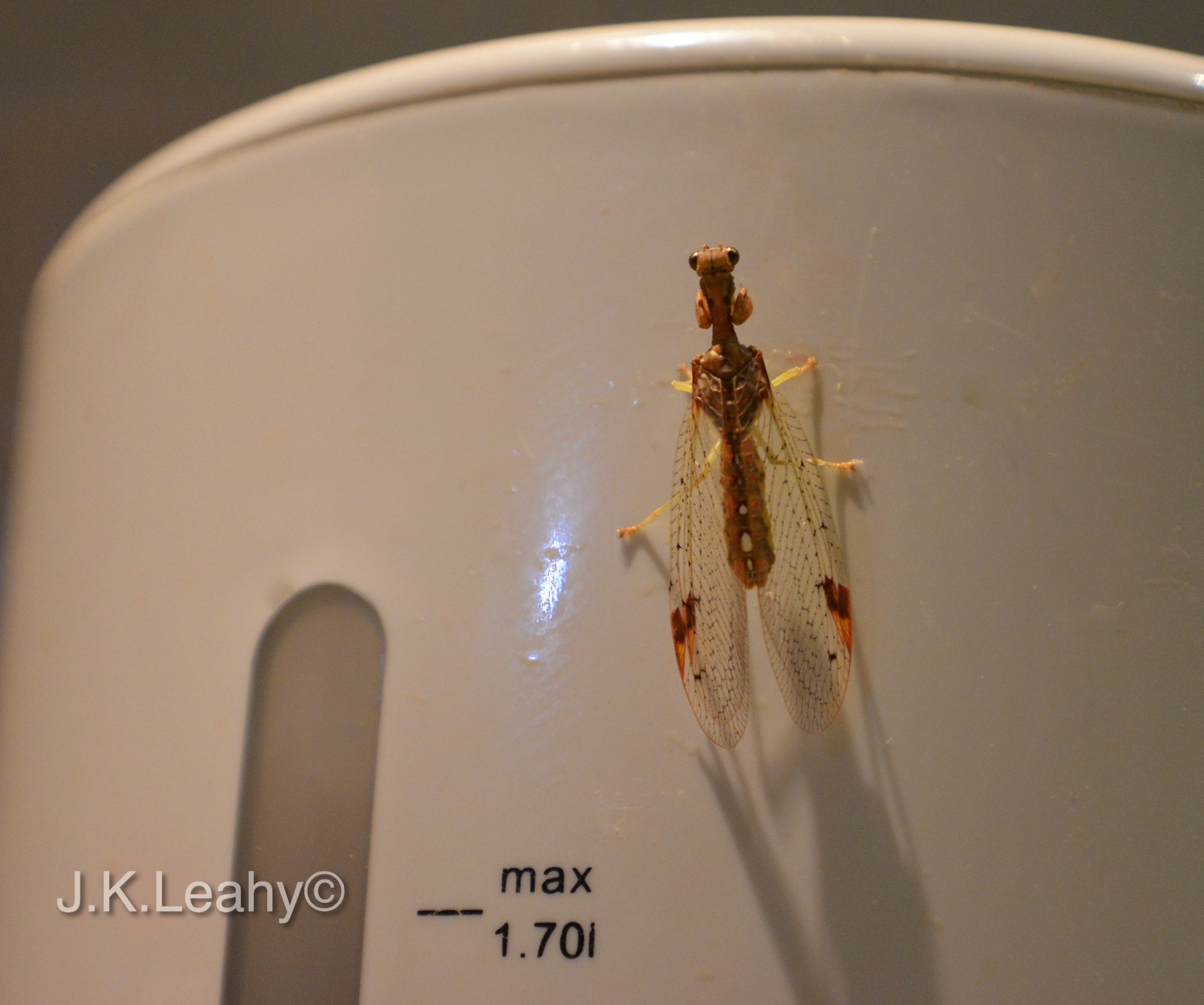 Praying Mantis Max is on the hot water jug. J.K.Leahy Pic.