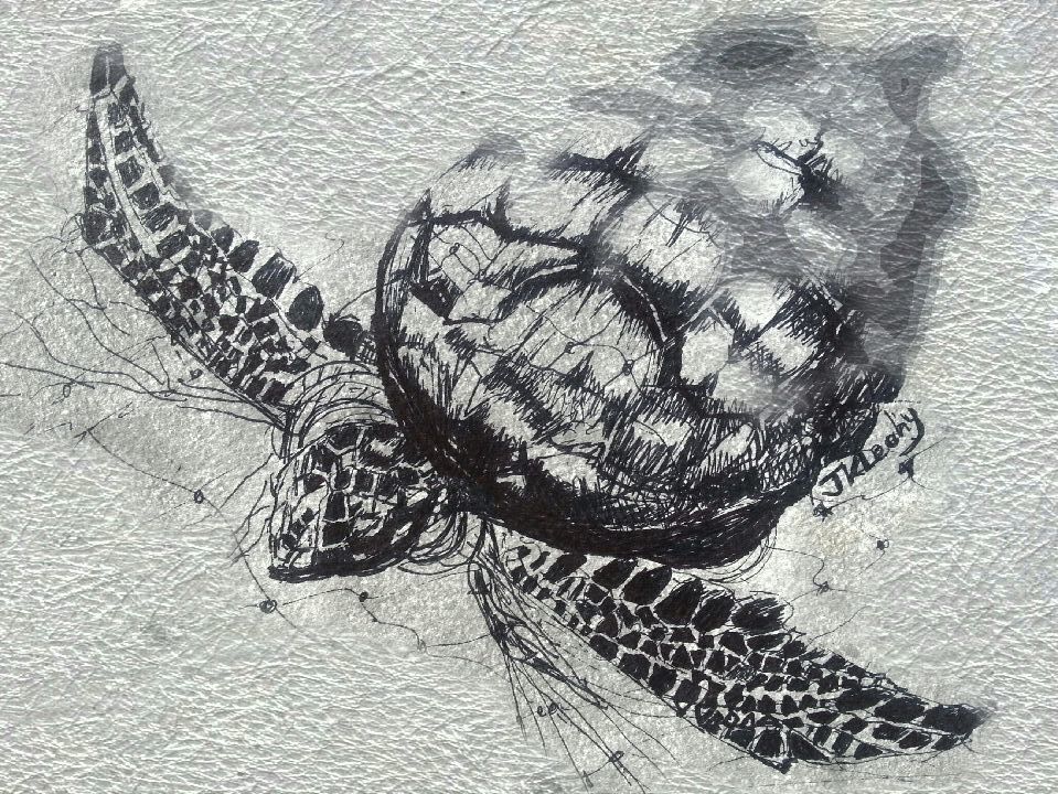 She could see smaller turtles floating about, their heads bobbing in the water. The turtles circled the net. They were all making strange noises like they were crying too. The mother turtle was bigger than Kalem’s ten-year-old body, but Kalem had to try save to her.