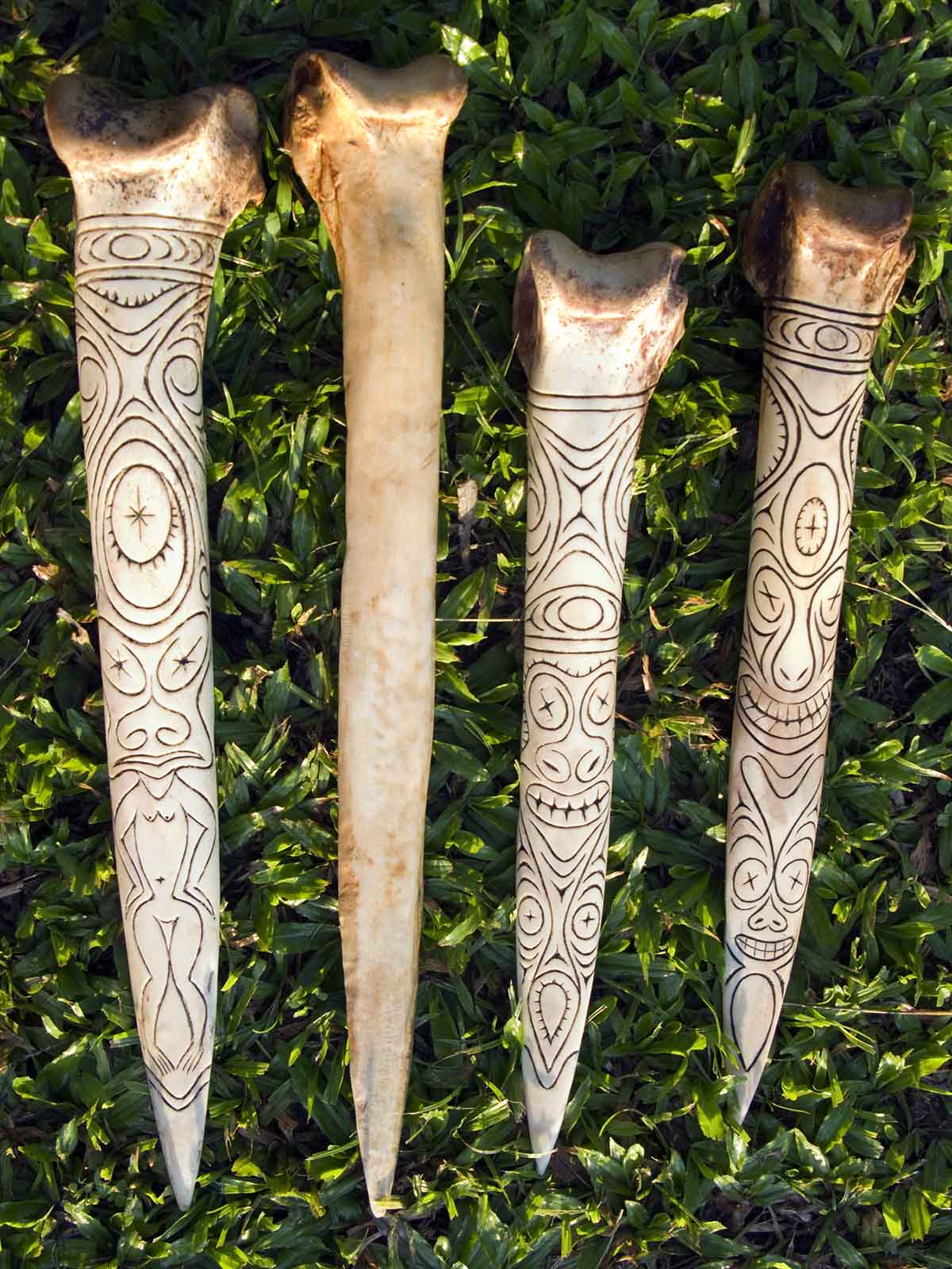 In Papua New Guinea(PNG), the cassowary is highly regarded in traditional myths as a source of life and spiritual energy. While cassowary is food in PNG cultures,  it is also kept as a pet. Cassowary feathers are used for headdress and bones used for tools. I remember my grandfather (mother’s father) kept a cassowary wing bone he used to stitch sago leaves together for our roof.  Some tribes, foe example the Abelam people in Sepik have used the femur of the cassowary birds to make weapons such as daggers (pictured below).