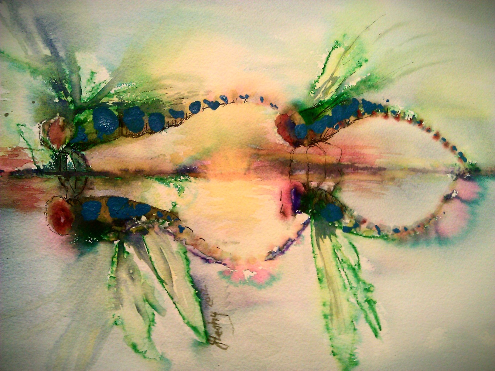 Mating dragonflies on water. Watercolour and inks on paper. J.Leahy. 2012